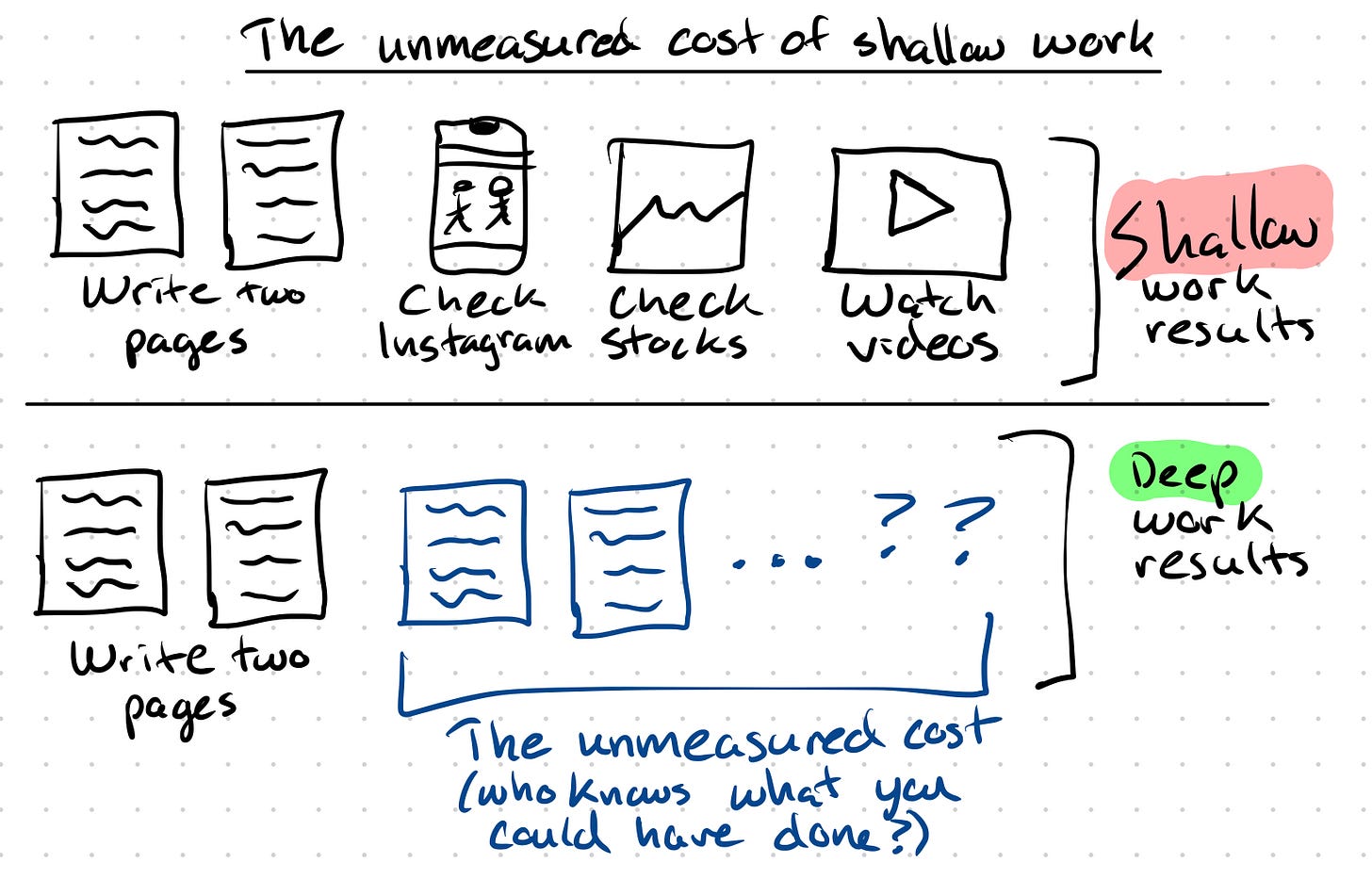 He also claims that the first two groups can be joined directly through deep work, while the third group can be indirectly joined via deep work, yet many current trends in the world make deep work rare, including open plan offices, instant messaging, and social media. These increase the proportion of shallow work, which is unmeasured and is the difference between what a metric is and what it could have been.